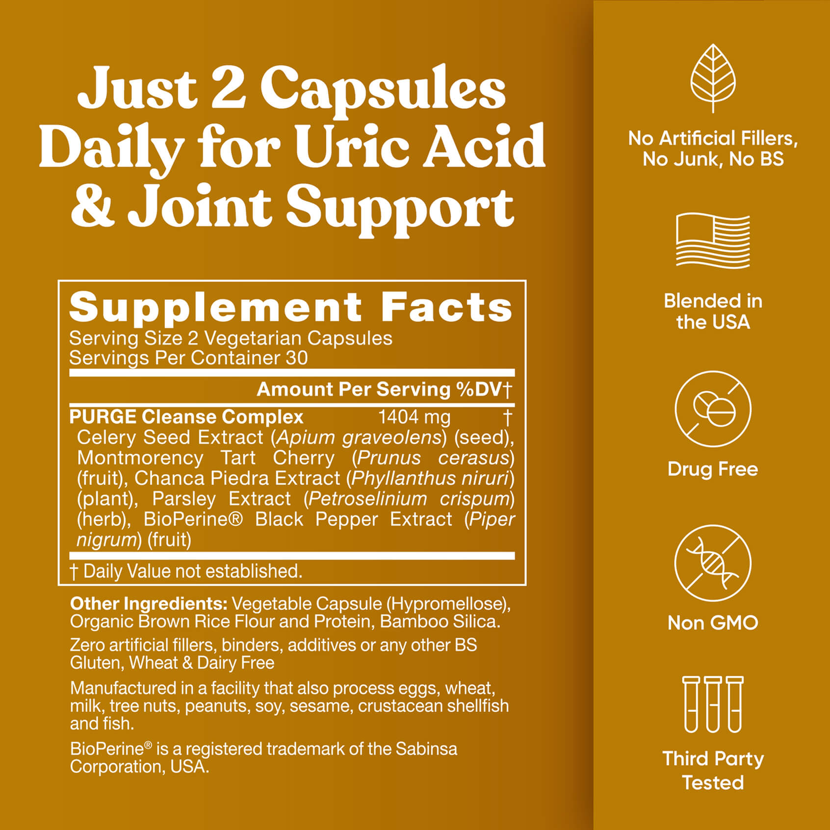 Crafted to flush, cleanse, and detoxify, Purge supports healthy uric acid levels for improved joint comfort and mobility. With potent ingredients like Celery Seed, Tart Cherry Extract, and Chanca Piedra, it naturally promotes balance without any artificial binders or additives.